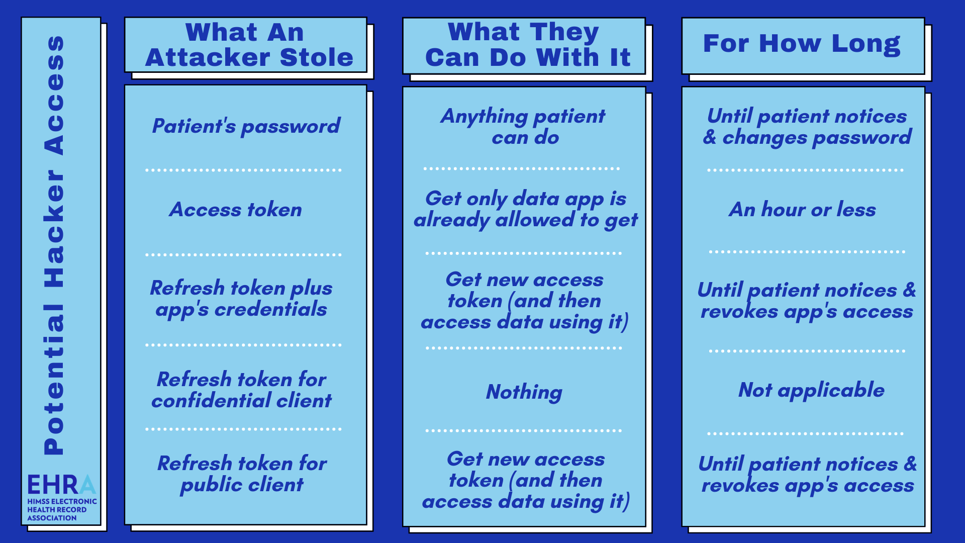 When a patient wants to let an app access their EHR data (using FHIR-based APIs), there is no technical reason why the patient couldn’t directly provide the app with the login and password for their patient portal account. However, that is generally not recommended. Directly providing an app with login credentials for another service or app results in security vulnerabilities should those credentials be compromised. That’s one of the reasons cybersecurity experts recommend everyone use unique passwords for each online account.