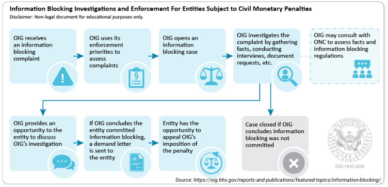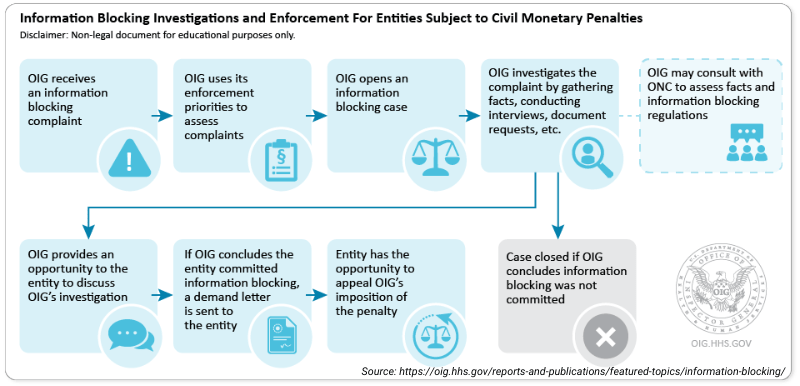 As for the final resolution, the best-case scenario is that the case is closed with a finding that no information blocking violation occurred. If that doesn’t happen, the options are to try to negotiate a settlement or see the investigation through and pay or appeal any CMPs that may be levied.