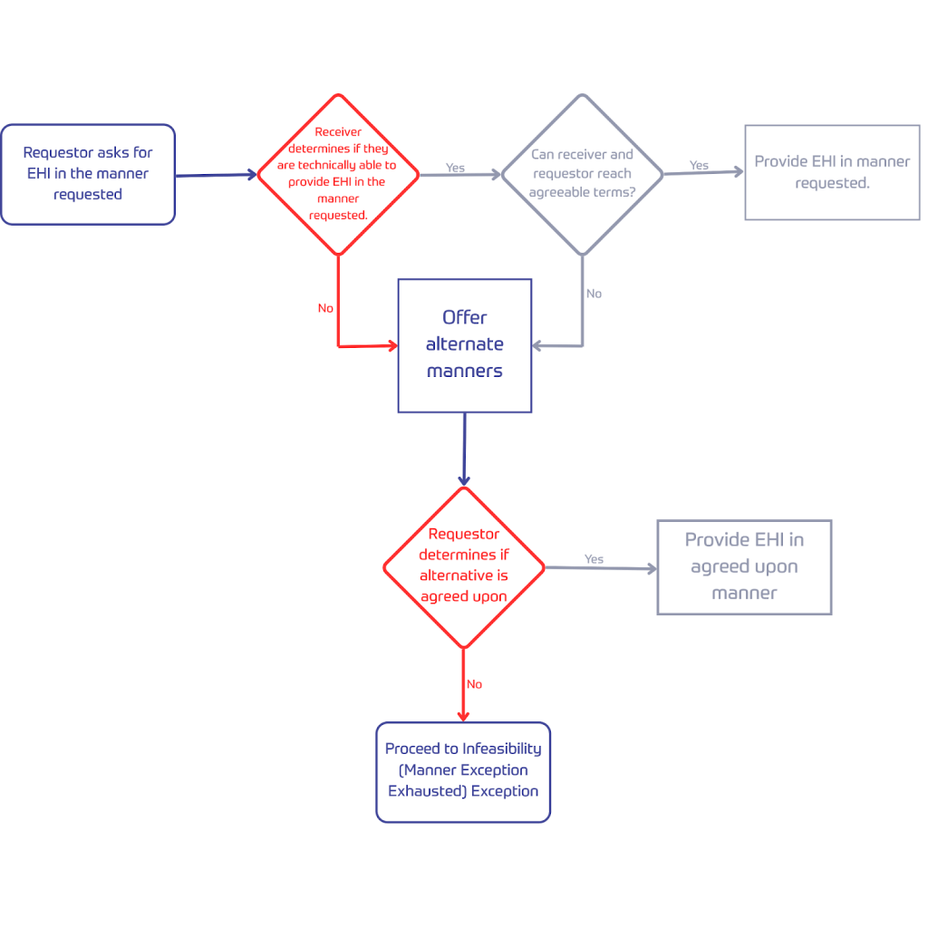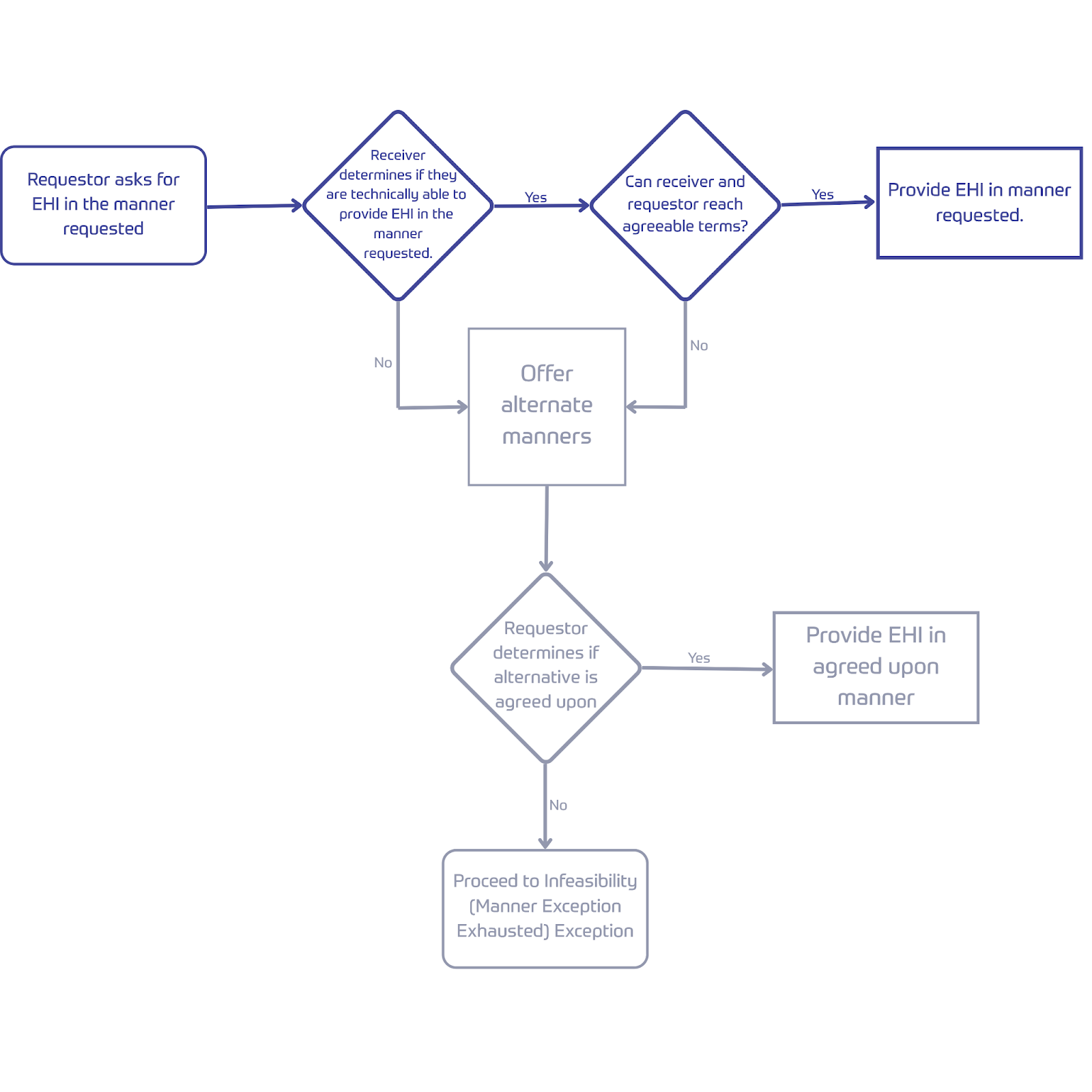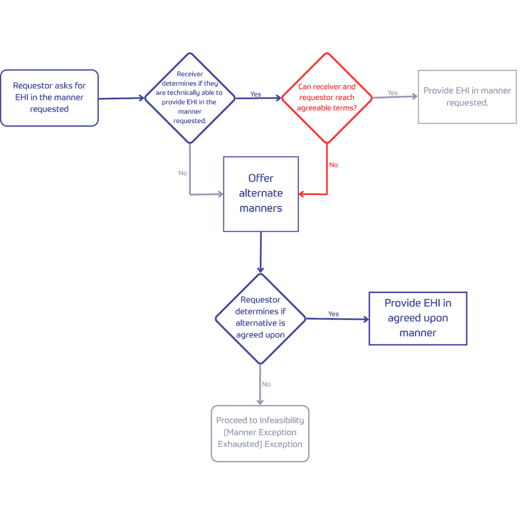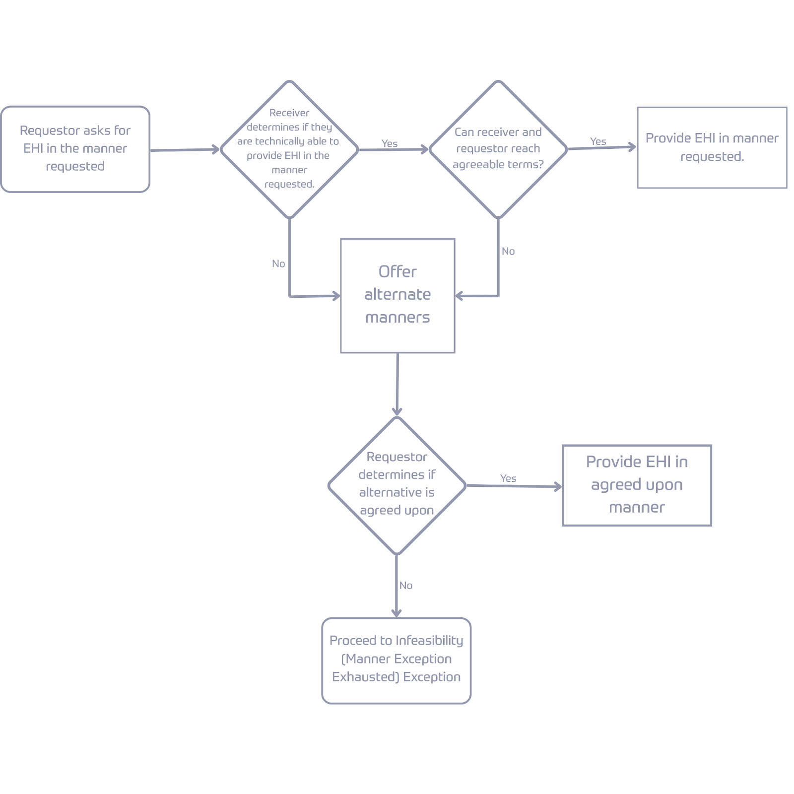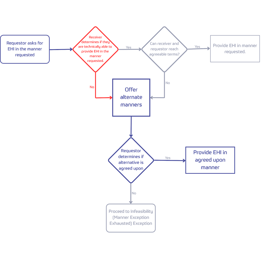 The Manner Exception can be visualized as a flowchart, with the starting point being the request for EHI in a specific manner, or the “manner requested.” From there: